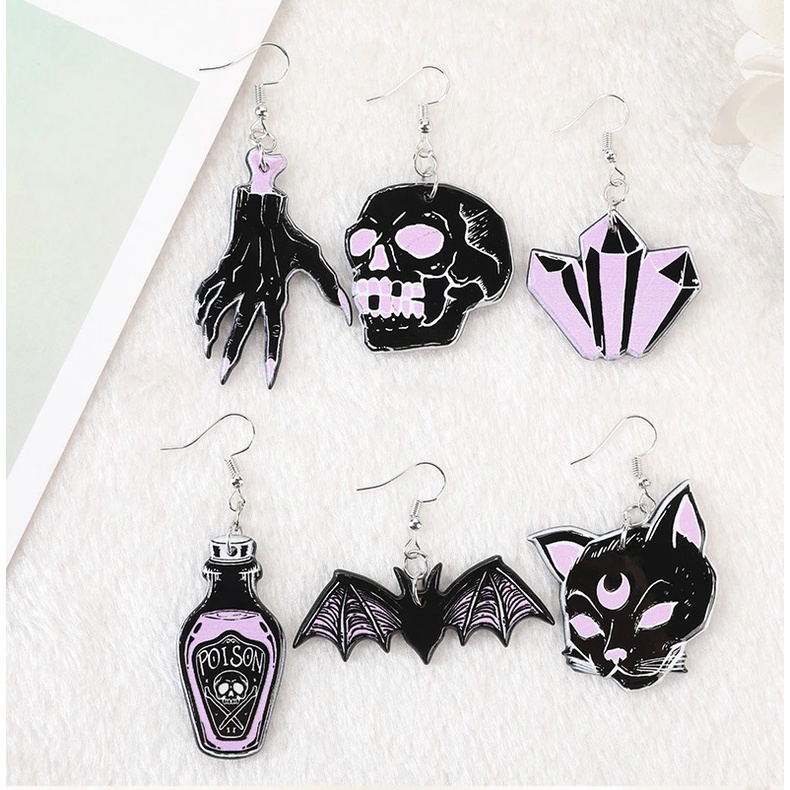 Par de Brinco Preto Halloween Psicodelico Gato Wicca Mon Lua Skull Diamante Mão Zumbi De Acrilico Anime Morcego Porção Poison Dark Rock Kawaii