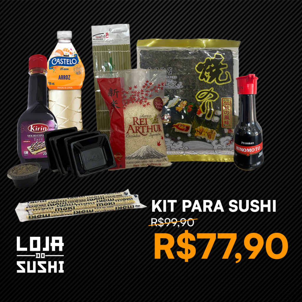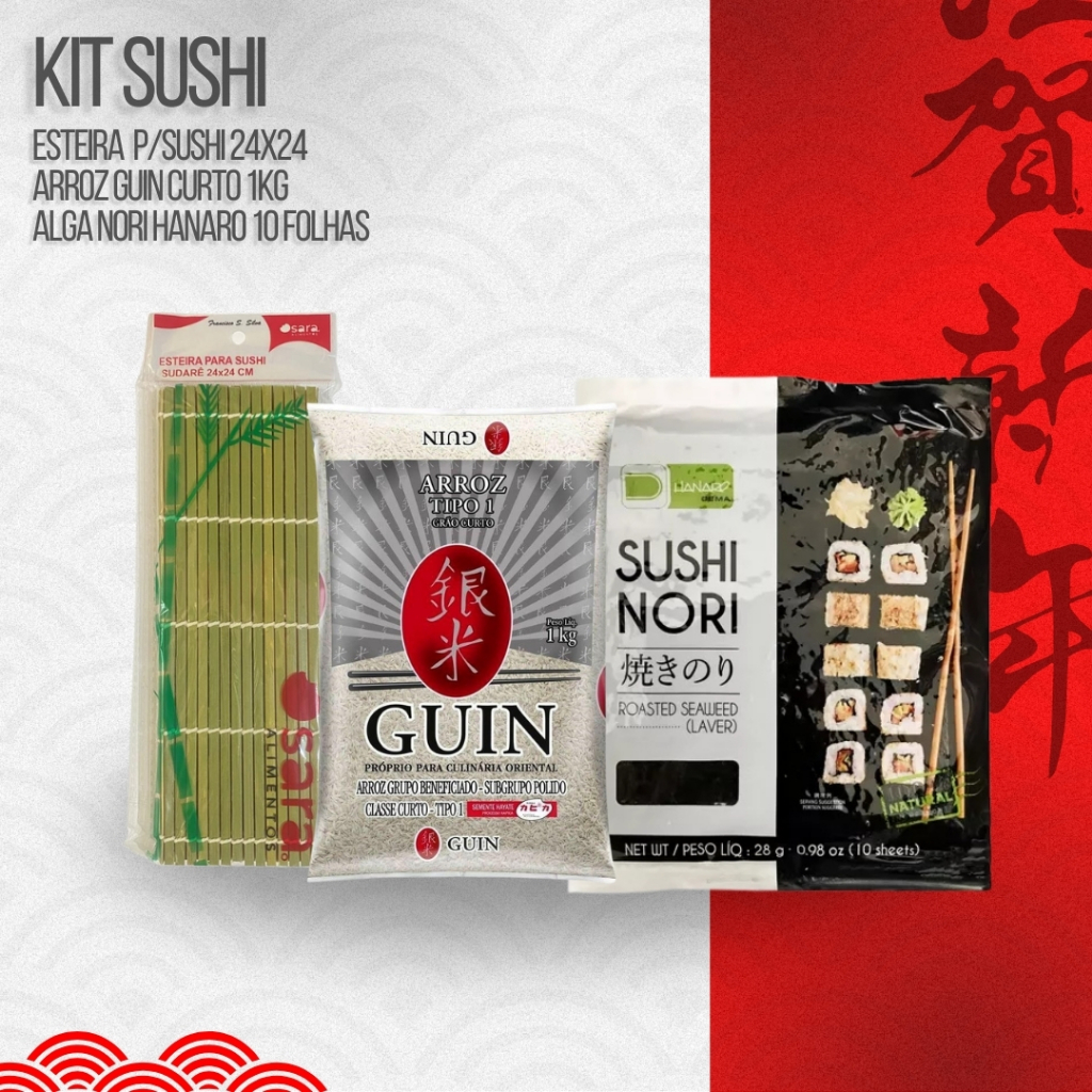 Kit Básico para Sushi com 8 itens (Arroz Guin longo , Alga Nori Edomae 10 folhas, Esteira, Shoyu 150ml, Vinagre Kenko Sakura )