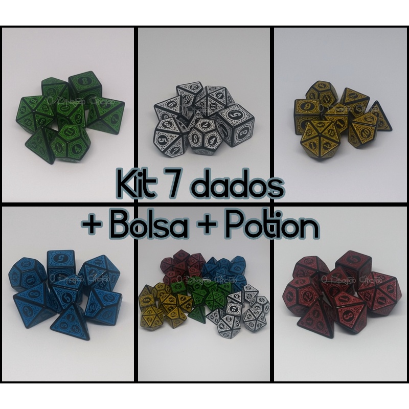 Kit 7 Dados RPG D4 - D6 - D8 - D10 - D10% - D12 - D20 + Poção decorativa + Bolsa / D&D Dungeons and Dragons Tagmar Tormenta