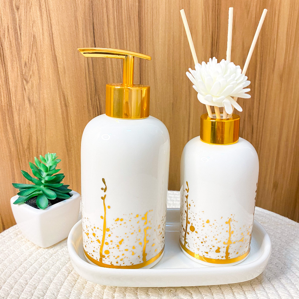 Kit Banheiro Lavabo Porta Sabonete liquido Dispenser e Porta Escova de Dente Cerâmica/Porcelana para Decoração