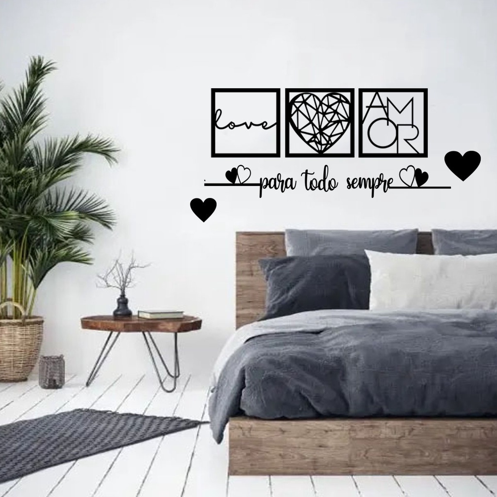 KIT 3 Quadros Para todo Sempre, Love e Coração Geométrico Amor + 2 Mini Apliques de Coração Frase de Parede Religioso MDF Preto C/Dupla Face