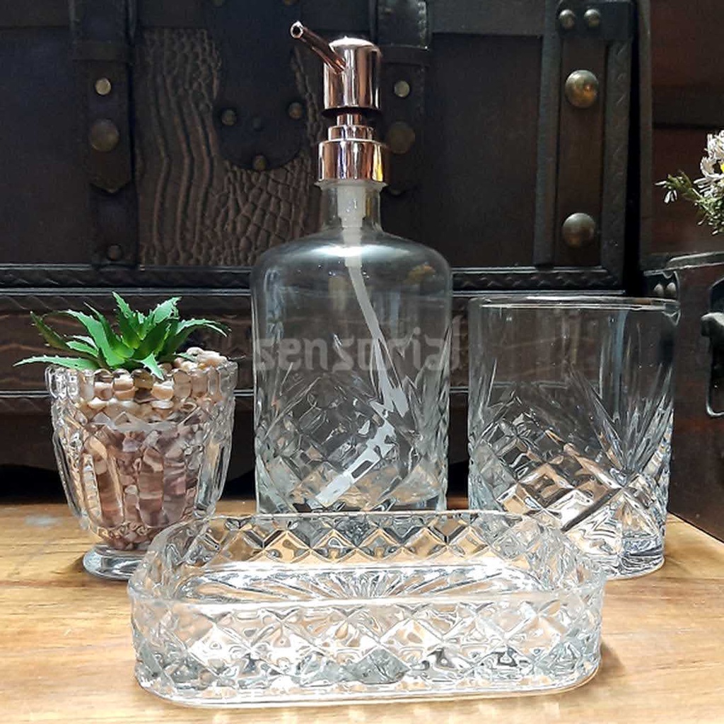 Jogo Kit De Lavabo Banheiro Luxo Vidro Grosso Trabalhado Conjunto 3 Peças Rose Gold