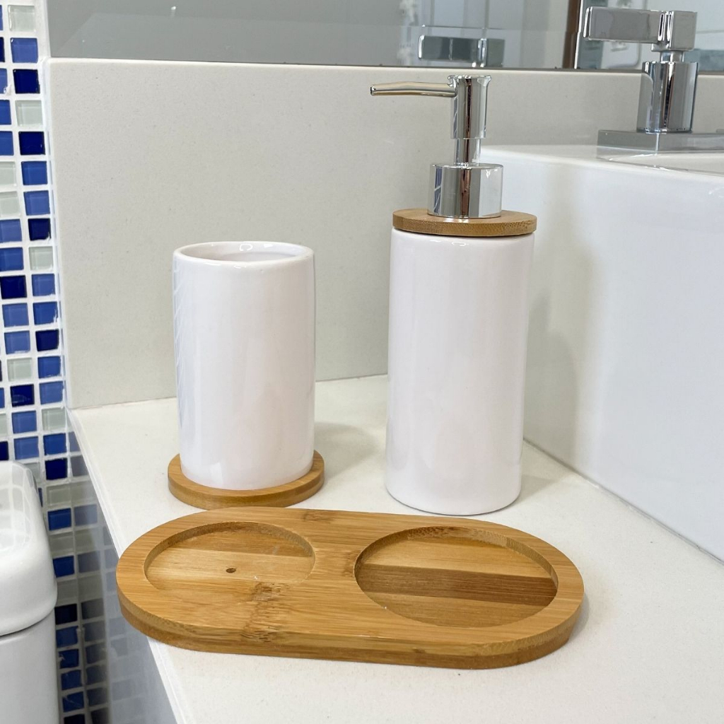 Kit Banheiro Lavabo Conjunto Saboneteira Porta Escova Porcelana Base Bambu 3 Peças Bamboo