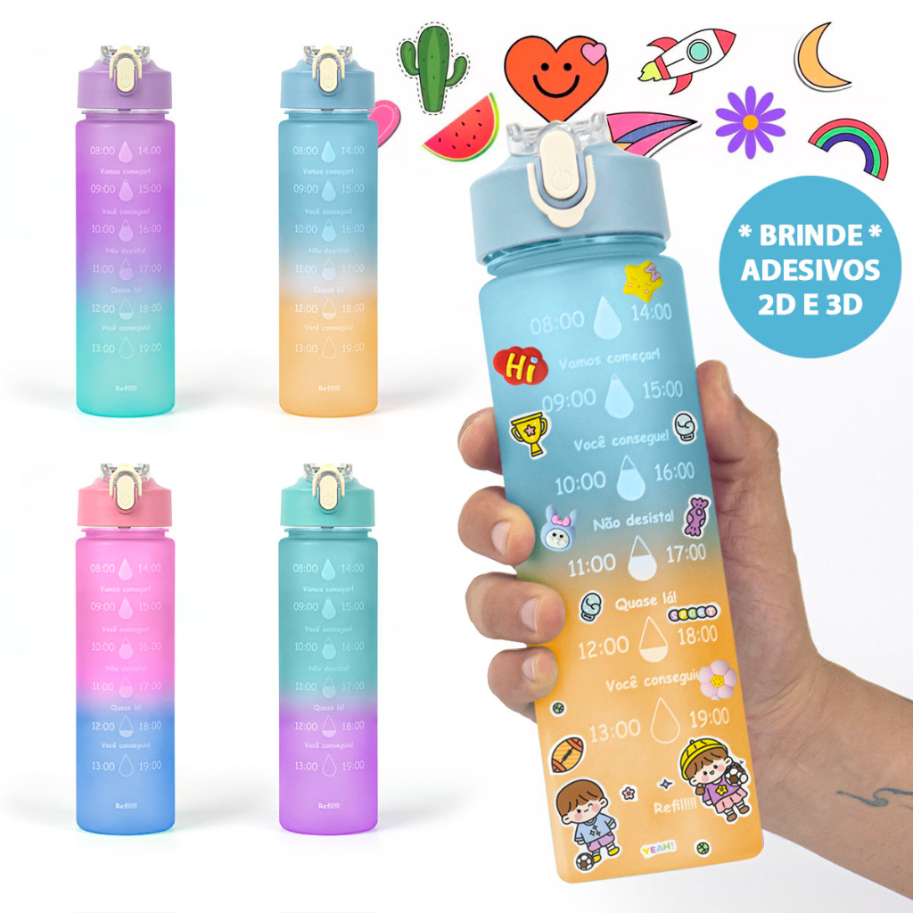 Garrafa de Água 750ml c/ Adesivos Fofo 2D e 3D Colorida Squeeze Portátil Garrafinha Frases Motivacionais Degradê Academia Escola