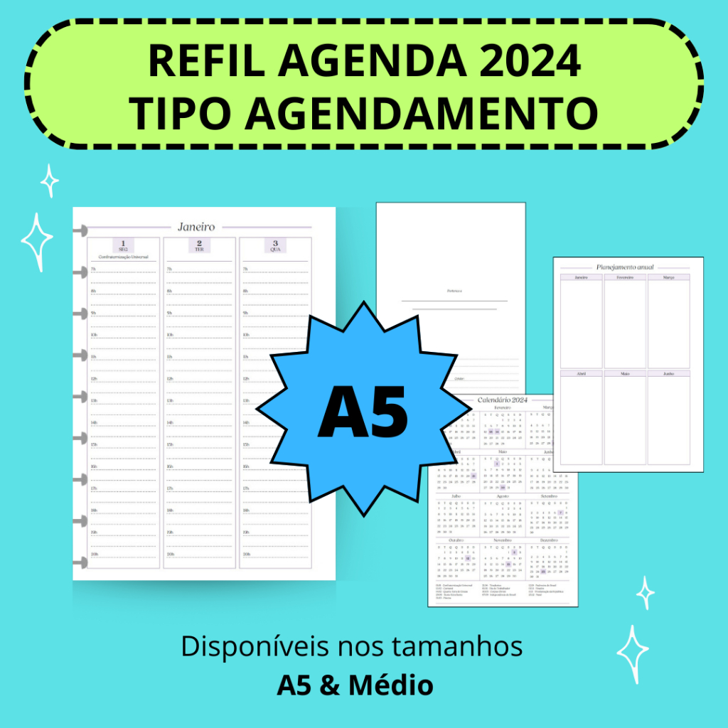 Refil A5 Agenda 2024 Semanal para Caderno Inteligente e Caderno de Disco