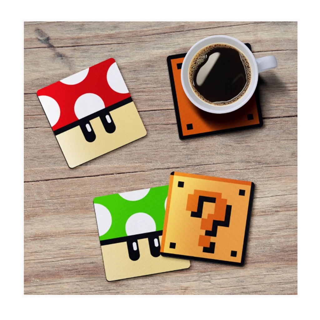 Kit 4 Porta Copos Bolacha Descanso MDF Decoração Mesa Posta Madeira Super Mario Interrogação Luigi Toad Corte Laser