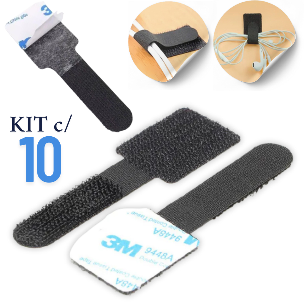 Organizador de Fios E Cabos com Velcro e Adesivo Dupla Face - Kit com 10 unidades
