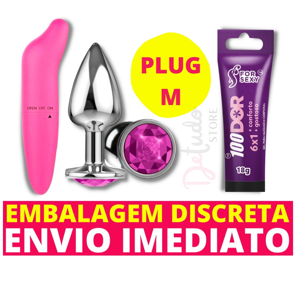 Plug Anal Tamanho M Médio Joia + Lubrificante Gel Para Anal 100 dor + Vibrador Pequeno Silencioso Ponto G