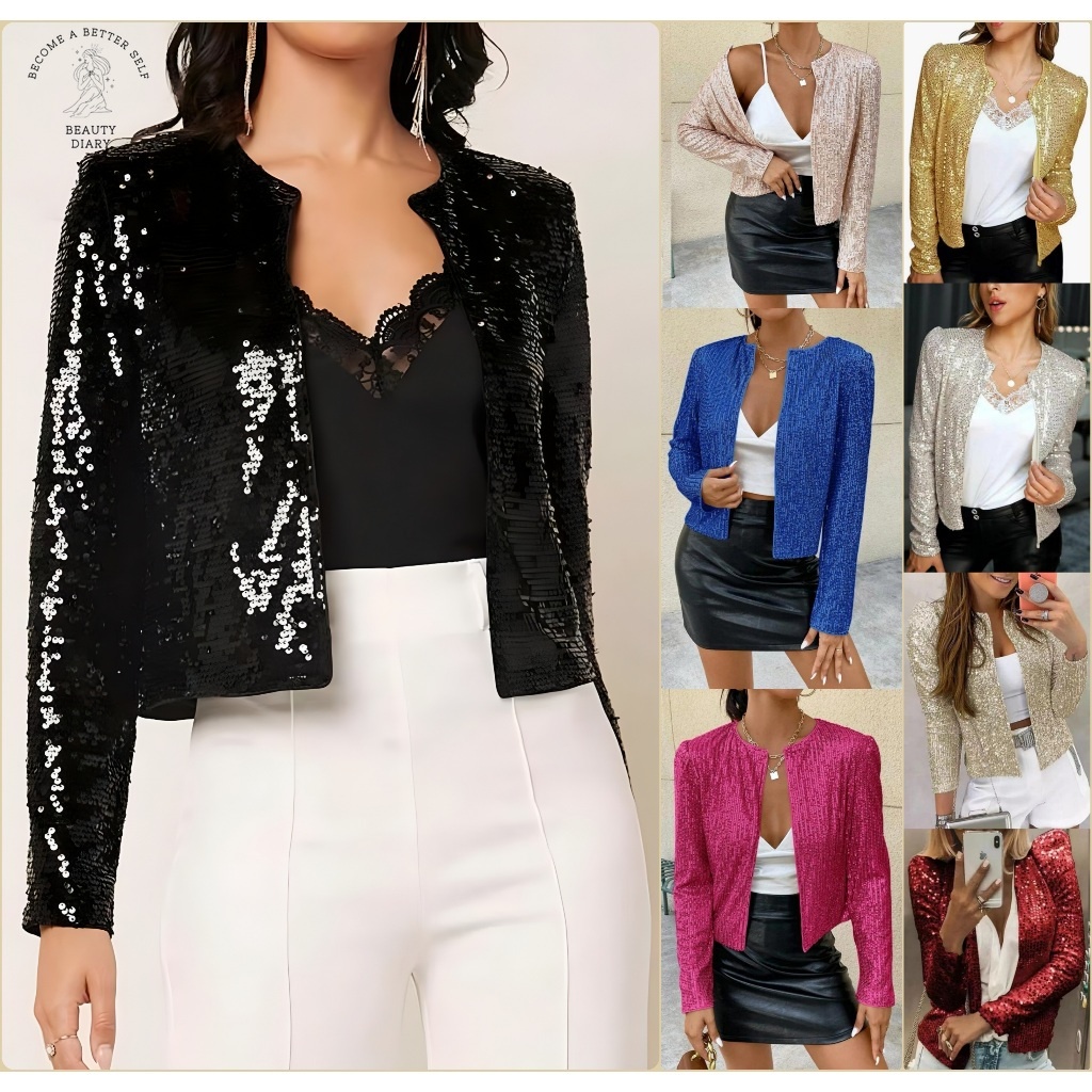 Blazer feminino alfaiataria de manga longa com lantejoulas glitter jaqueta curto primavera/outono/inverno para clube/festa/social/casual P-XXXG