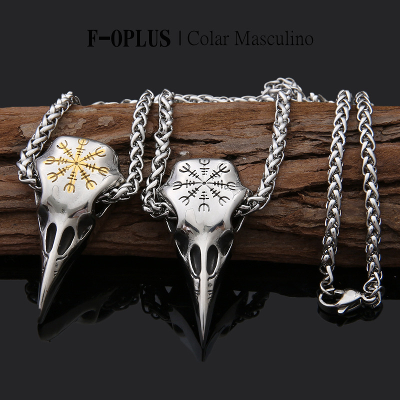 F-OPLUS | Colar Corvo Crânio Masculino Aço inoxidável 60cm 70cm Corrente Masculina com Pingente Corvo Runa Aço Cirúrgico,Fé Amuleto de Odin Viking TNM053