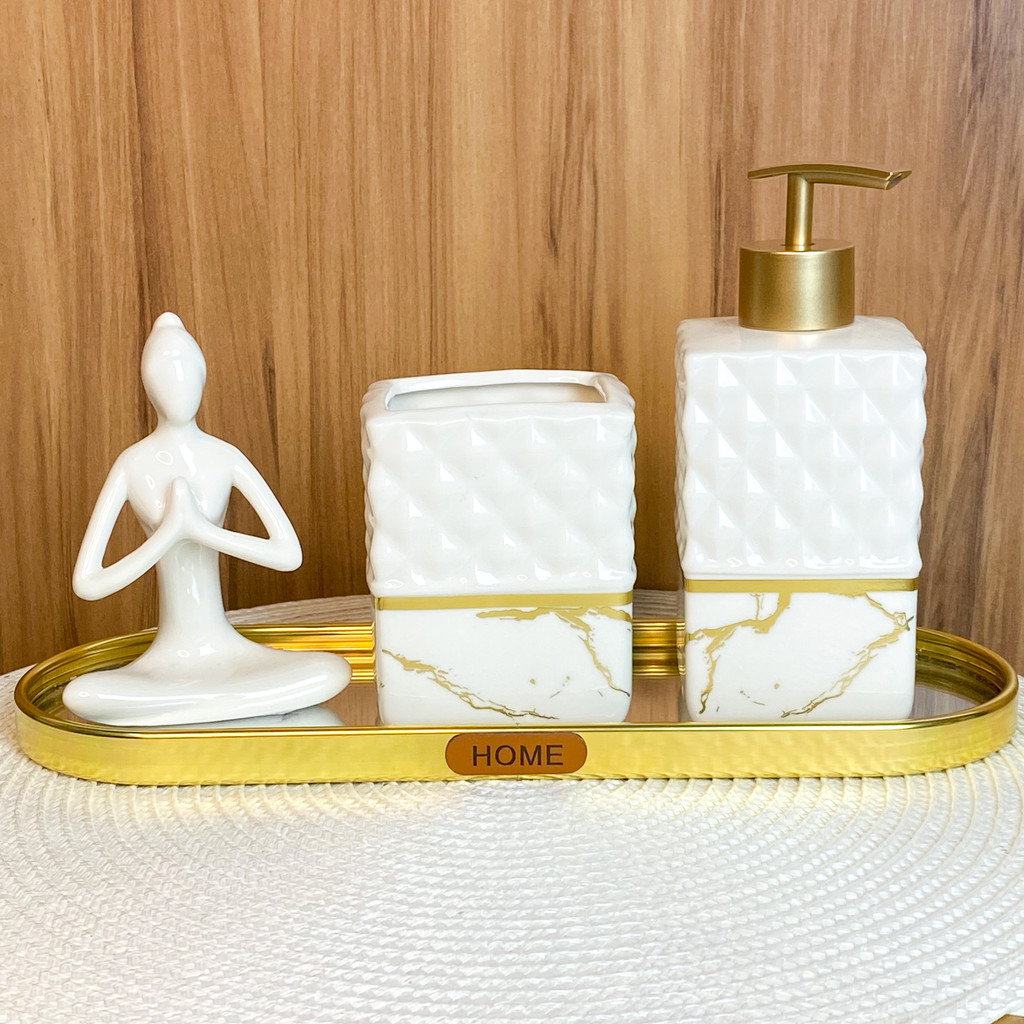 Kit Jogo de Banheiro Lavabo Porcelana 4 Peças Para Decoração Com Dispenser Sabonete Líquido e Porta Escova de Dente