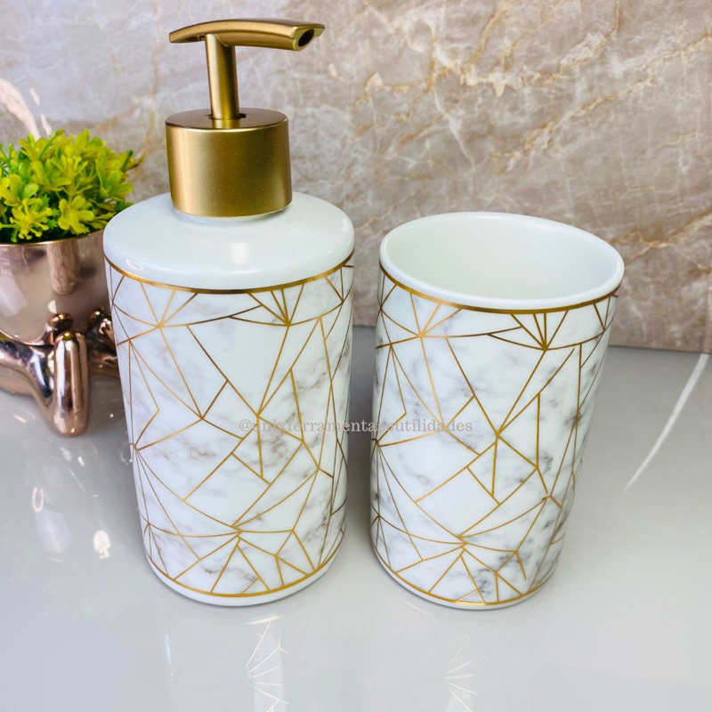 Kit Banheiro Lavabo Porta Sabonete liquido Dispenser e Porta Escova de Dente Cerâmica/Porcelana para Decoração