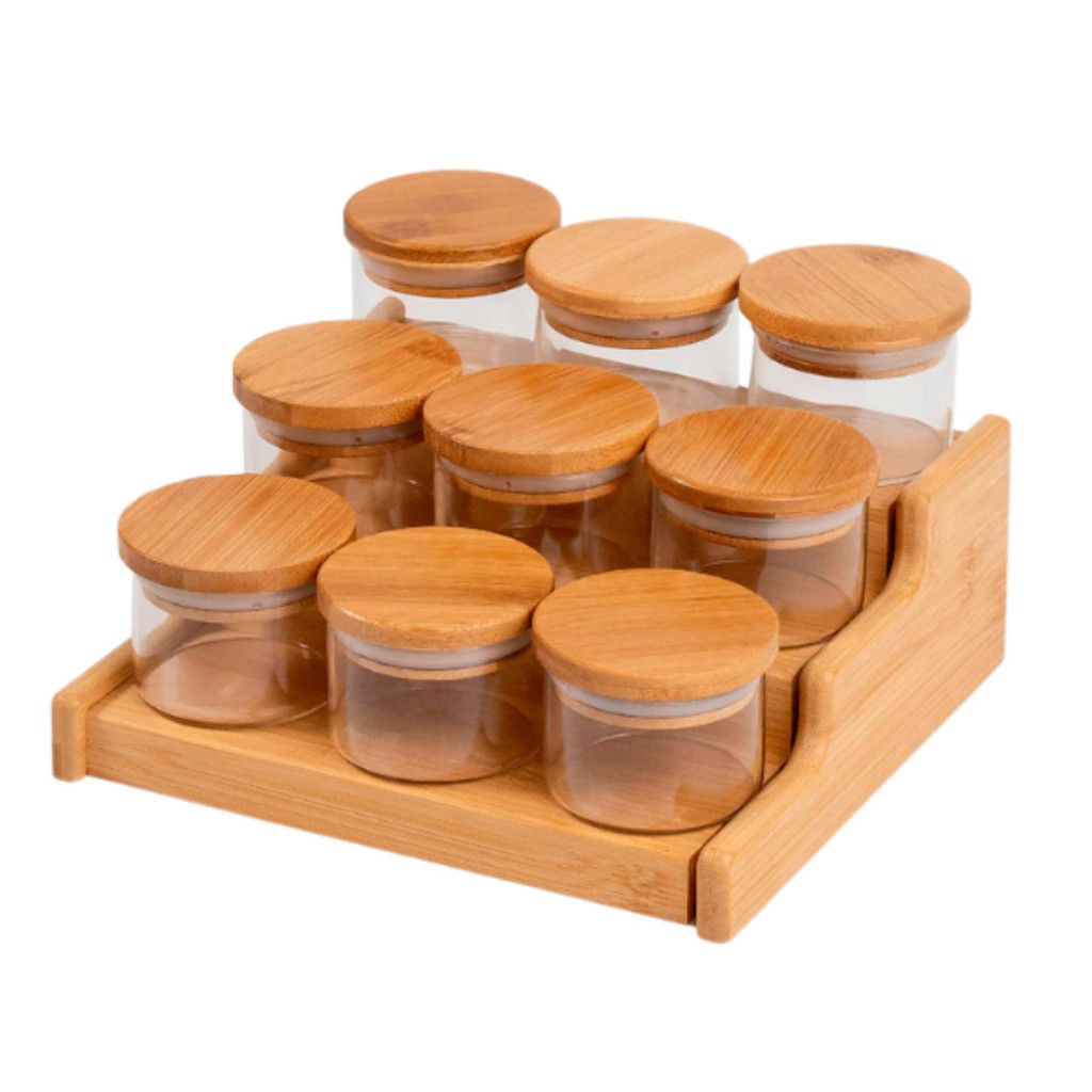 Kit 9 Potes De Mantimento Porta Tempero 110ml Vidro com Tampa De Bambu Oikos