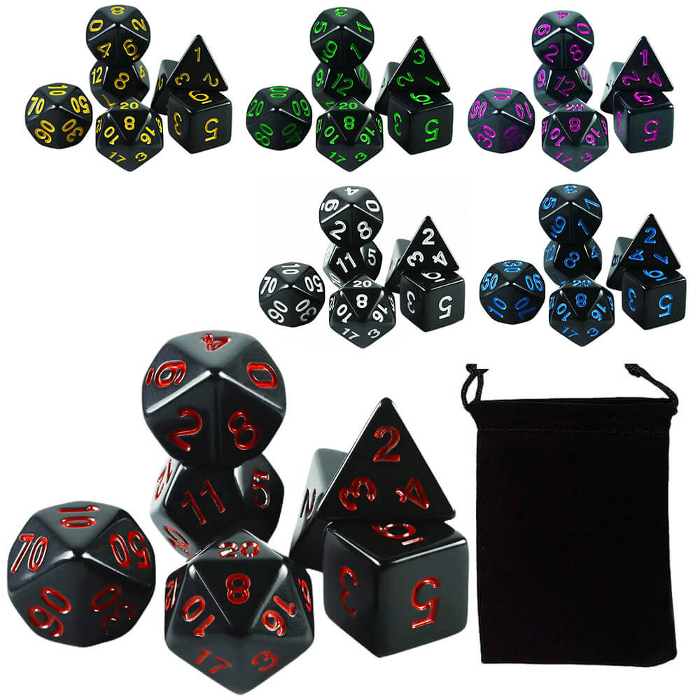 Conj. 7 Dados Pretos com Bolsa PROMO - Kit Para RPG DnD Pathfinder Várias Cores Dungeons and Dragons Jogos de Tabuleiro