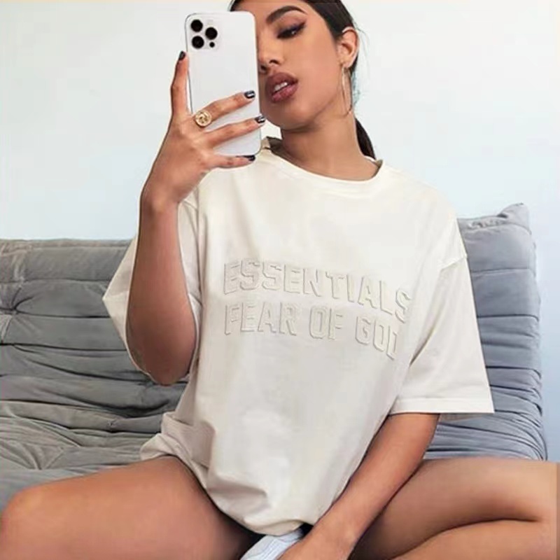 FEAR OF GODF FOG Essencials Temporada 8 Linha Dupla High Street Loose Casual Chest Pequeno Logotipo Flocking Impressão Manga Curta Casal Puro Camiseta Algodão
