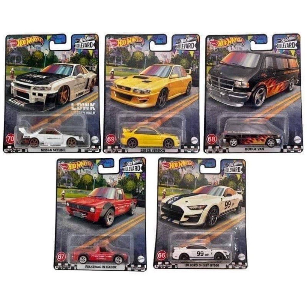 Hot Wheels Premium Boulevard 2023 - (Dodge Van, 20 Ford Shelby GT500, 98 Subaru Impreza 22B-STi Version, LB-ER34 Super Silhouette Nissan Skyline, Volkswagen Caddy) 1:64 Diecast Scale Model Car