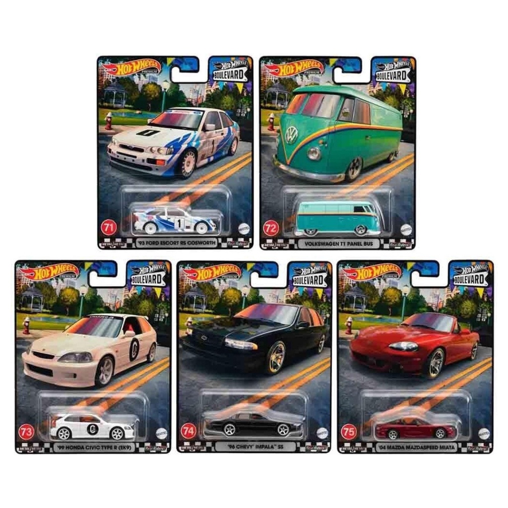 2023 Hot Wheels Premium Boulevard ( 3 Ford Escort RS Cosworth White Blue, Volkswagen T1 Panel Bus Mint Green, 99 Honda Civic Type R EK9 White, 96 Chevy Impala SS Black, 04 Mazda Mazdaspeed Miata Red ) 1:64 DIECAST SCALE MODEL CAR