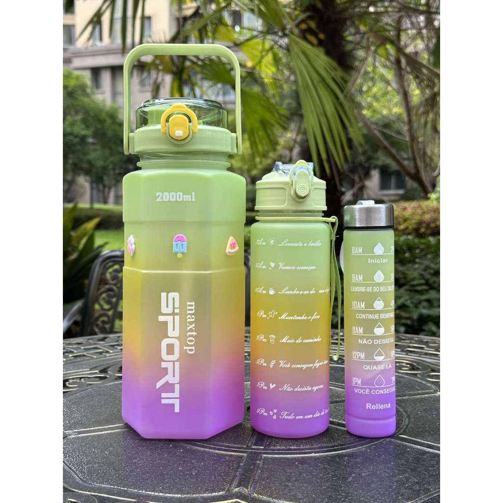 kit 3 Garrafa De Água Squeeze Academia Com 2000ml 900ml e 300ml Portátil Adesivos