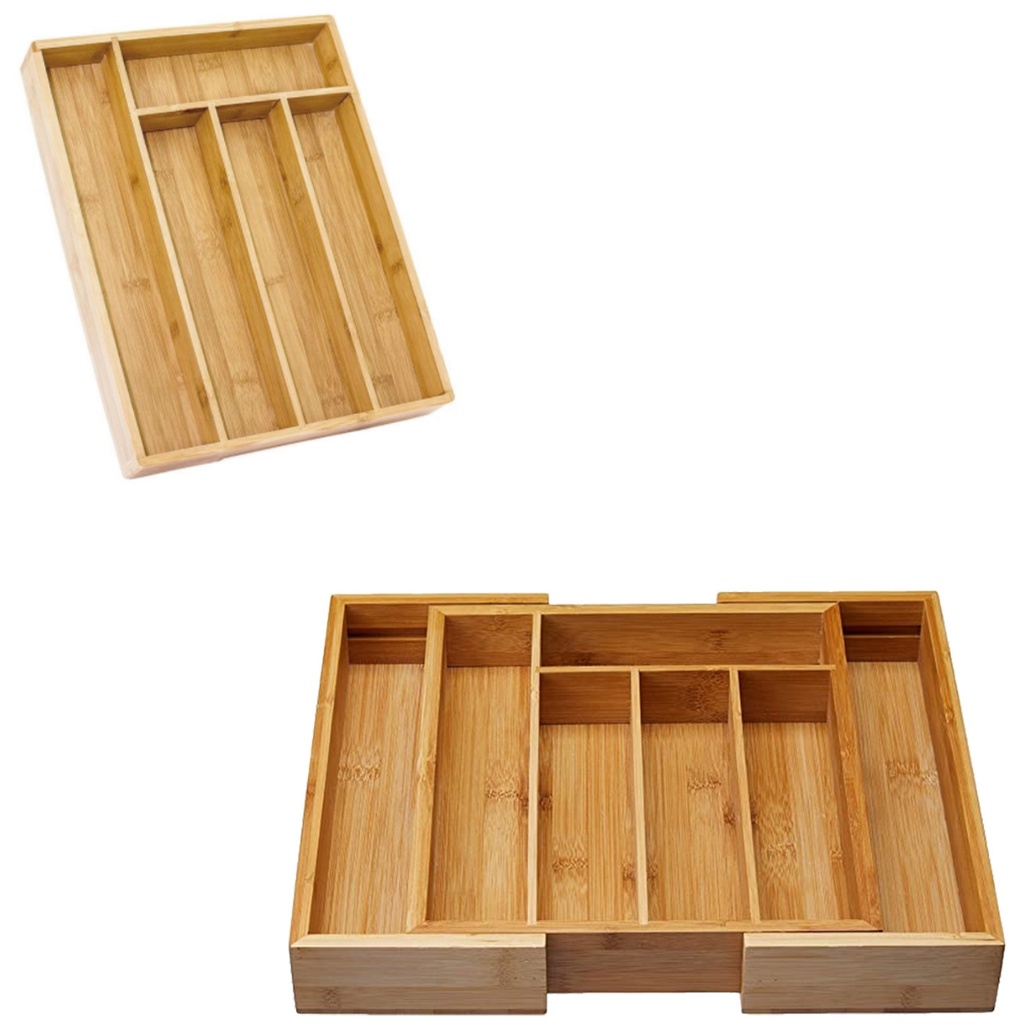 Porta Talheres Bambu Organizador 5 Divisórias Gaveta Grande Extensível