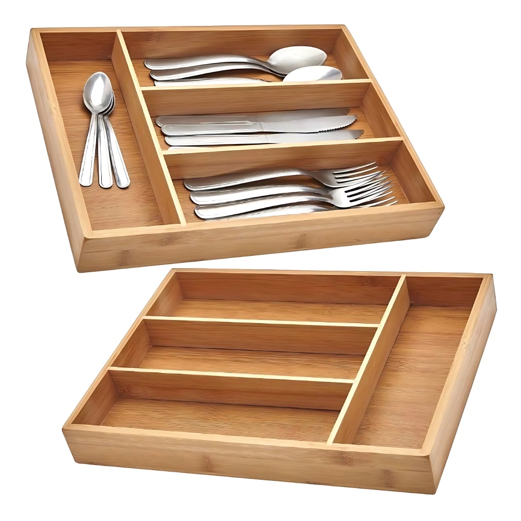 Porta Talheres Bambu Organizador 4 Divisórias Para Gaveta Divisor Madeira Bambu Cozinha Multiuso