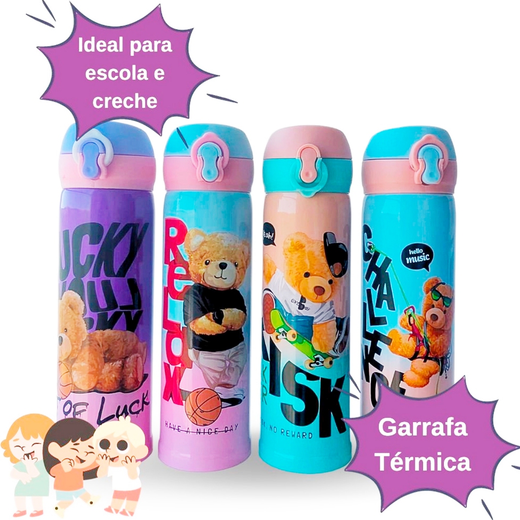 Garrafa Squeeze Térmica Aço Inox 450ml Infantil Portátil Com Tampa E Sistema De Trava Ursinho