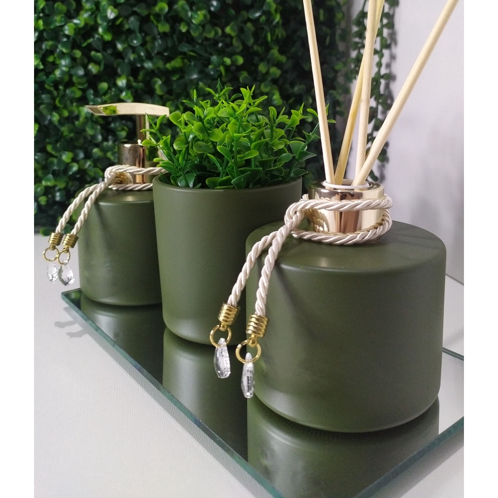 Kit Lavabo Picolo Verde Luxo 250ml Aromatizador Difusor + Porta Sabonete Líquido + Vaso