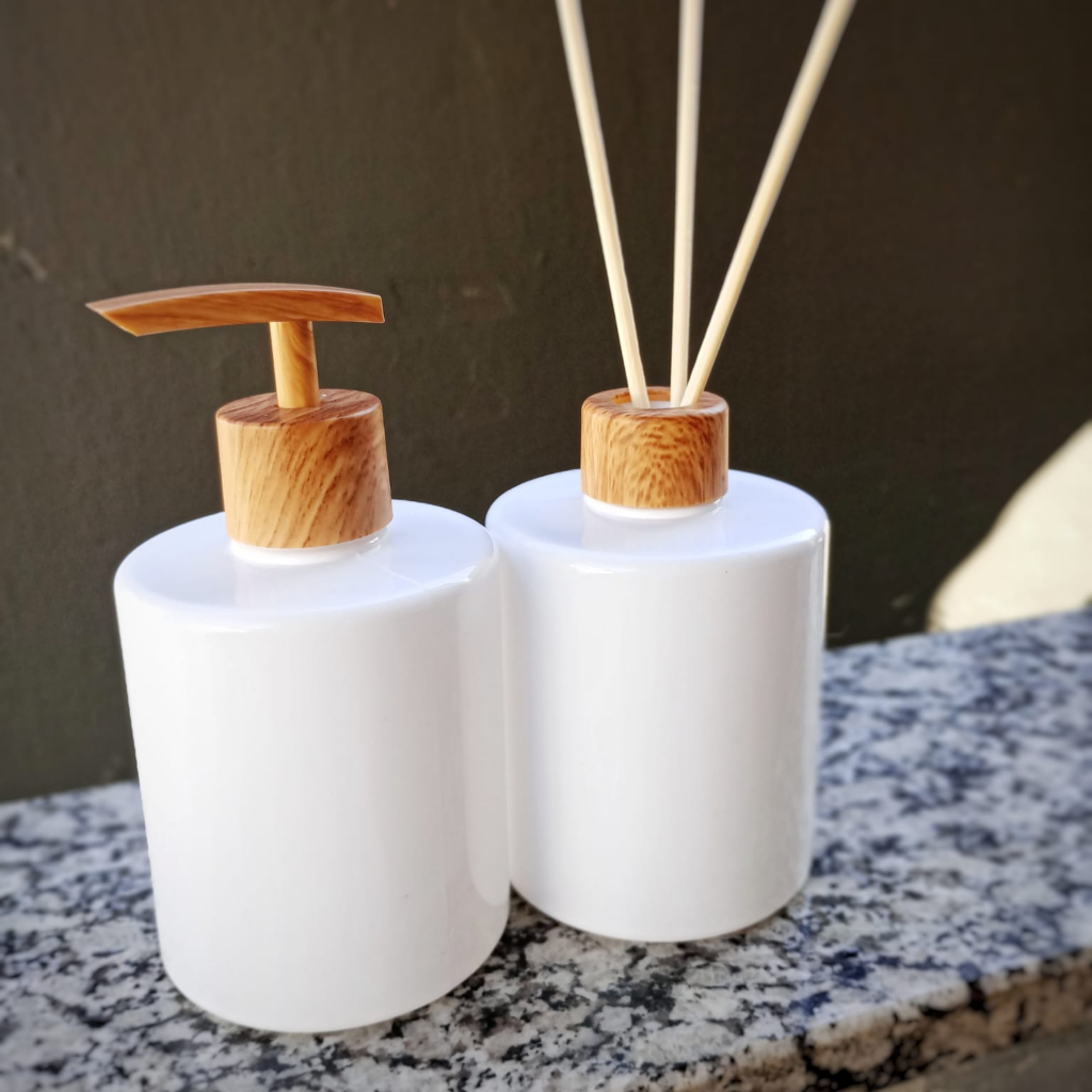 Kit Lavabo Porta Sabonete Liquido e Difusor de Essências Plástico Pet Branco e Cor Bambu 350ml