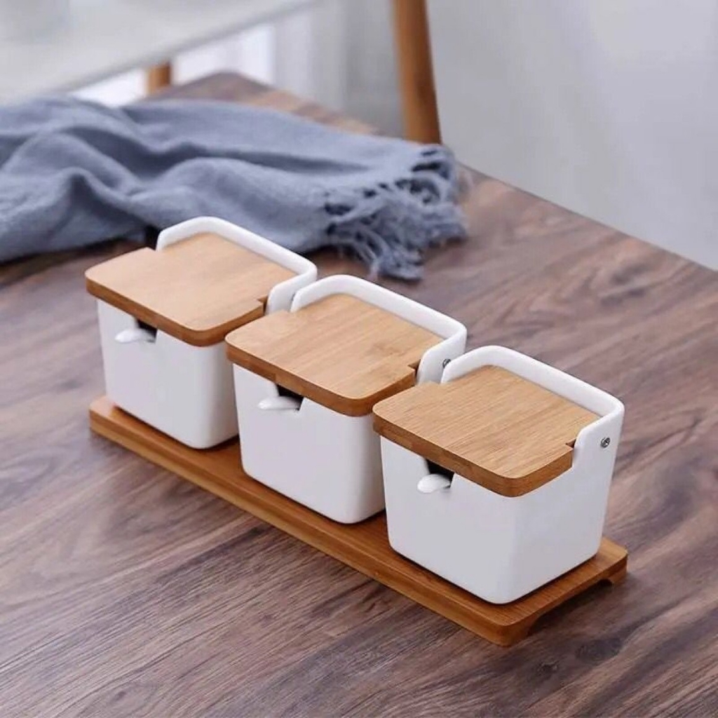 Porta Condimentos ,Temperos Saleiro Açucareiro, Pimenteiro, Farinheiro De Porcelana Com Colher Armazenador com Tampa de bambu