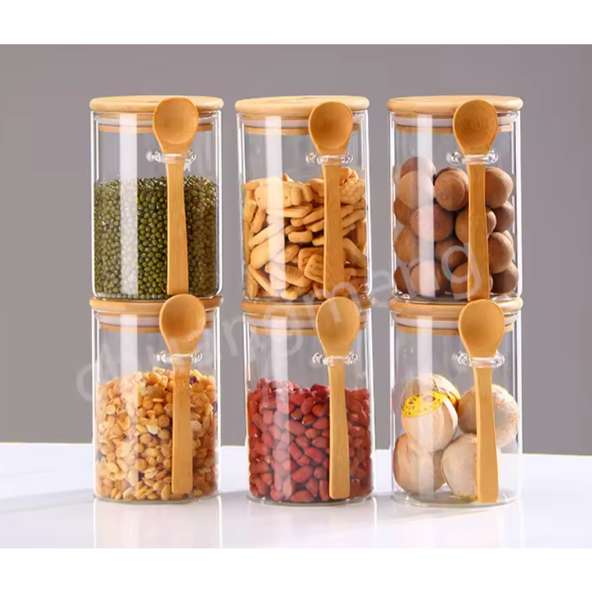 Kit Potes Porta Mantimentos Tempero Hermético Açucareiro, Saleiro em Vidro Borossilicato com Tampa E Colher de Bambu com vedação 400ml / 450 ml / 550 ml |Allmix|