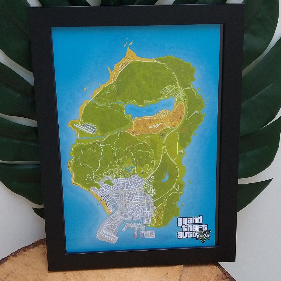 Quadro decorativo com moldura e vidro GTA 5 Mapa pôster gamer geek nerd