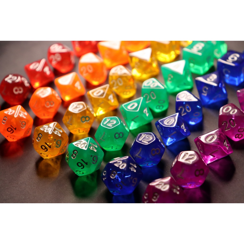 Kit 7 Dados Rpg de mesa Dnd D&d Tormenta20 Dungeons And Dragons 20 lados D4 D6 D8 D10 D10% D12 D20 Vermelho Laranja Amarelo Verde Azul Lilás Translúcidod ice set
