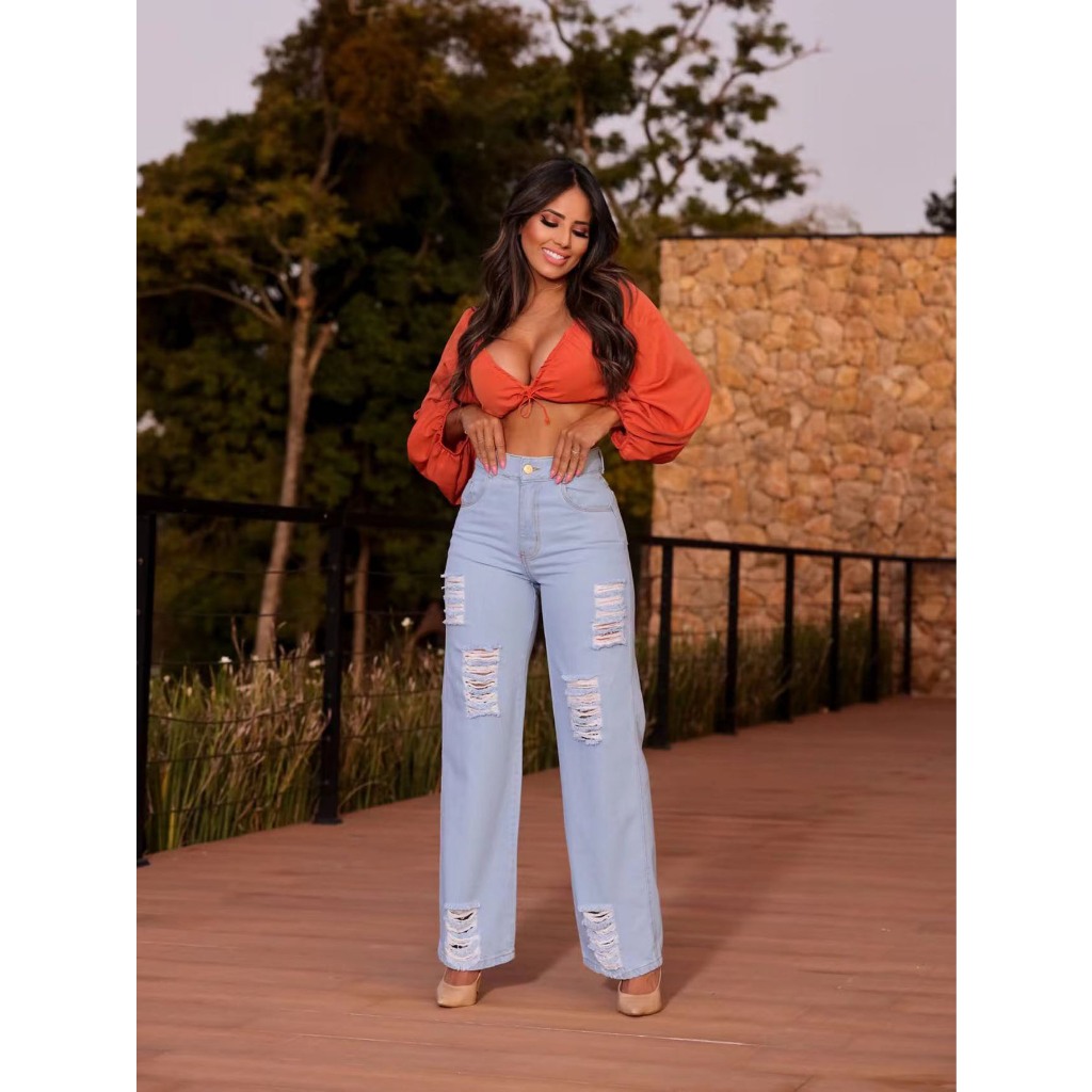 Calça Feminina Jeans Wide Leg Rasgado Cintura Alta Tecido Grosso muito bom Pantalona Linha Premium 100% Algodão