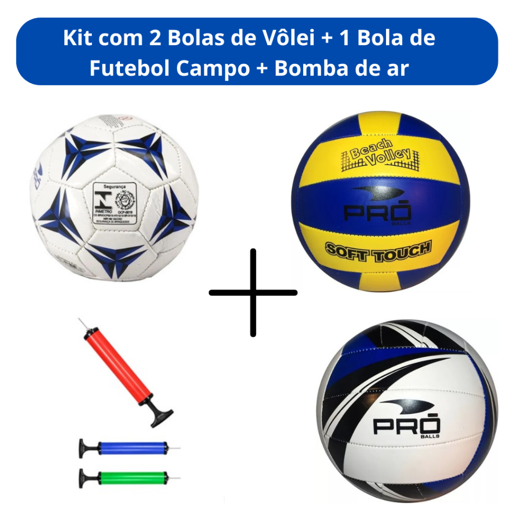 Kit com 2 Bolas de Vôlei de Quadra/Praia + 1 Bola de Futebol Campo/Society + Bomba de Ar com Bicos