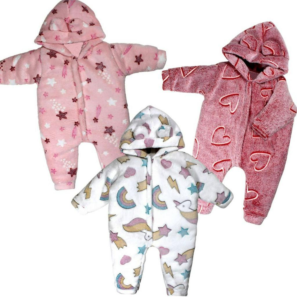 Kit 3 Peças Macacão Bebe Inverno Microfibra Com Capuz Menina