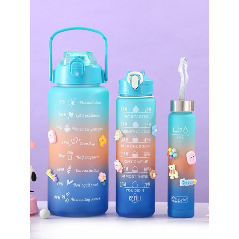 kit 3 Garrafa de Água com Adesivos 2D Motivacional em inglês/Português Squeeze Capacidade- 2000ml 900ml E 300ml Portatil Adesivos - com Frases Motivacionais com marcador. Garrafa de água de grande capacidade Não Vaza Ming