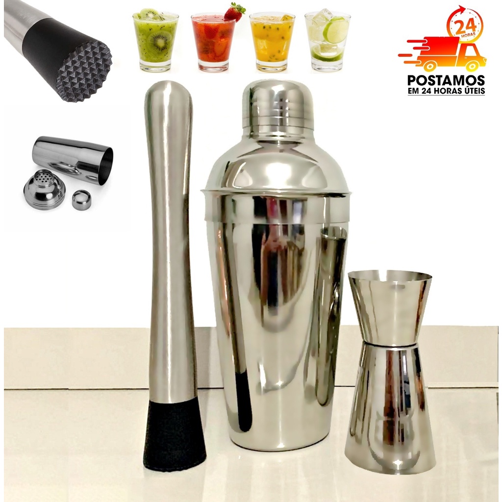 Kit ou avulso Bartender Inox Coqueteleira 3 peças 500ml - Socador - Dosador Drinks Caipirinha Premium