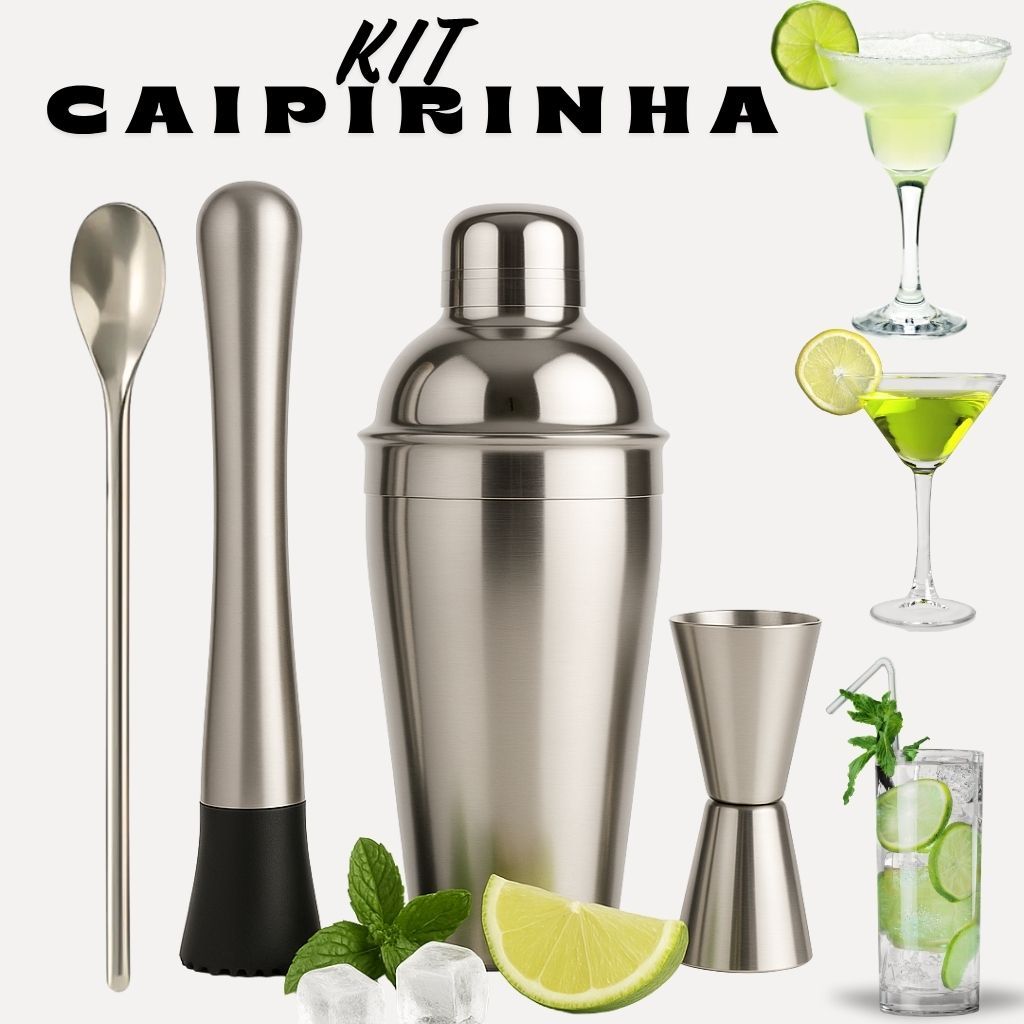 Kit Caipirinha Inox Completo Profissional com Coqueteleira 500ml, Socador, Dosador Premium