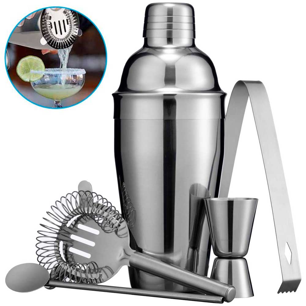 Kit Barman profissional 5 peças - dosador coador colher pinça coqueteleira Inox caipirinha batida drinks bartender festa coquetel gin vodka frutas
