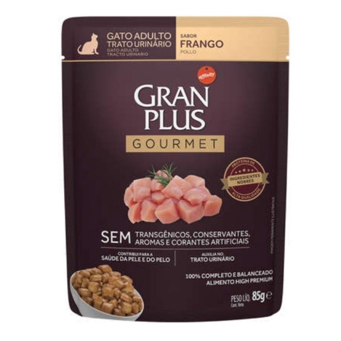 Caixa de Sachê Gran Plus Gourmet Gatos Adultos Trato Urinário sabor Frango 85g com 18 unidades