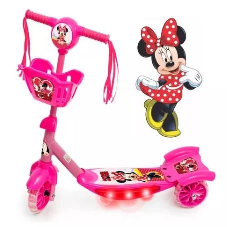 Patinete Infantil Minnie Mouse Musical Cesta Luzes 3 Rodas