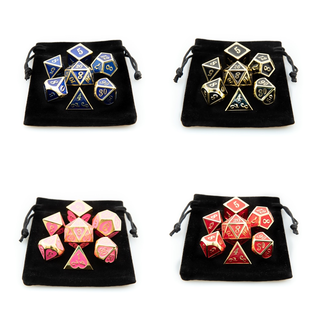 Kit 7 Dados em METAL para Jogar RPG de Mesa D4 D6 D8 D10 D10% D12 D20 + 1 BOLSA | VÁRIAS CORES E MODELOS