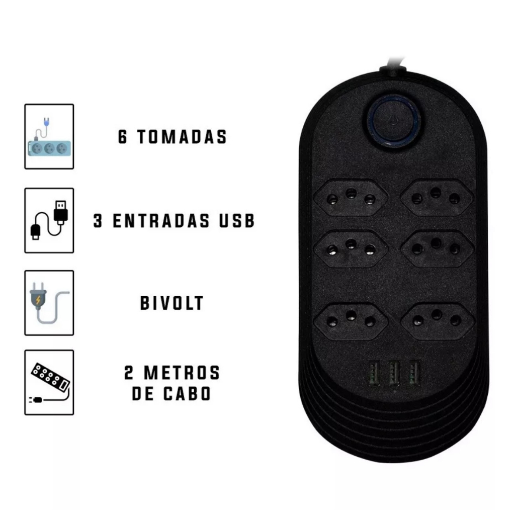 Extensão Fonte Régua Estabilizador 6 tomadas Saídas Filtro Linha de 3 USB