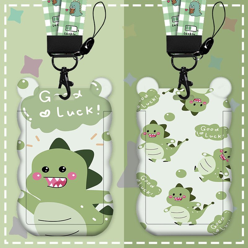 Anime Verde Pequeno Dinossauro Verde Novo Estilo Porta-cartões em forma de cabeça de urso Porta-cartões em forma de cabeça de urso Plástico liso Capa deslizante EasyCard Holder com Chaveiro Lanyard Wave Doctor Nurse Porta documentos Student Porta-cartões