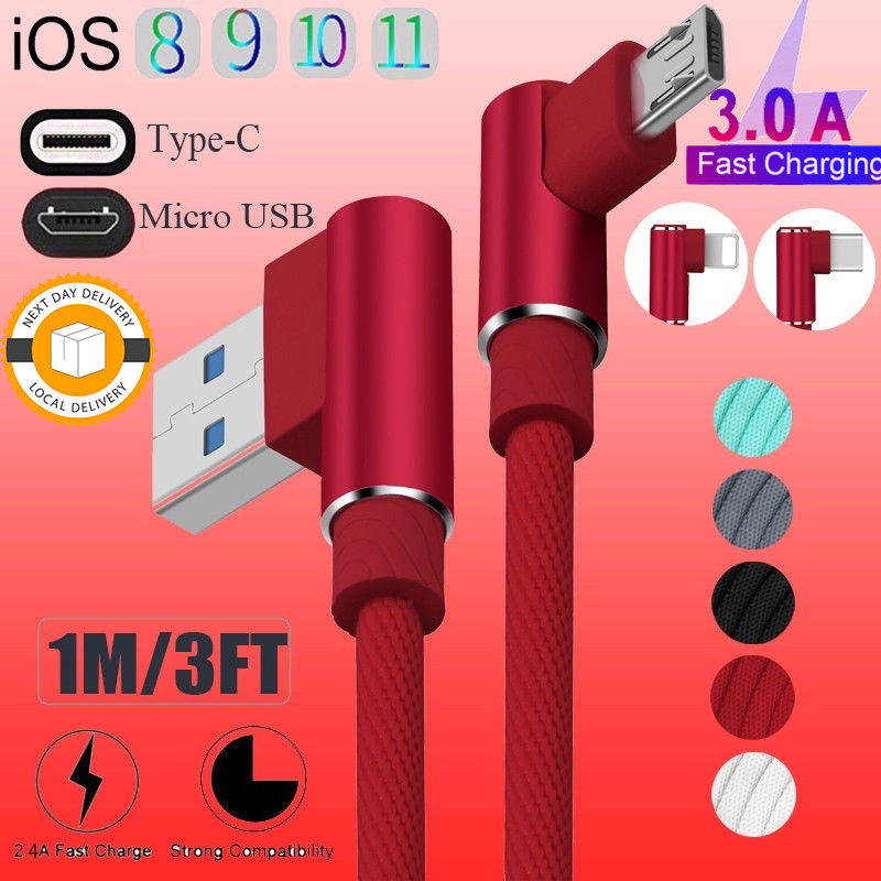 3M/2M Carregador Rápido De 90 Graus Cabo USB 3.0A Android Micro/Tipo C Chaging Cotovelo De Dados Trançado De Nylon Carre
