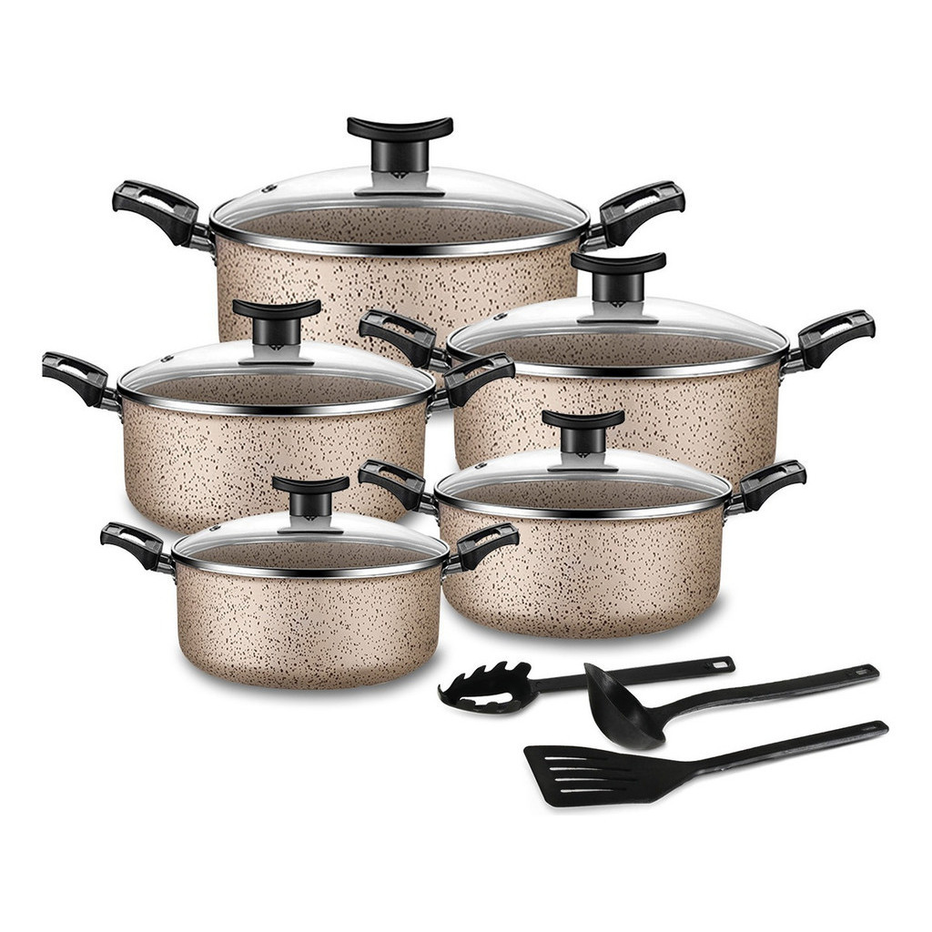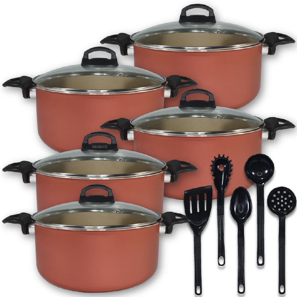 Jogo de Panelas 10 Peças Cereja Antiaderente com Tampa de Vidro e Utensílios