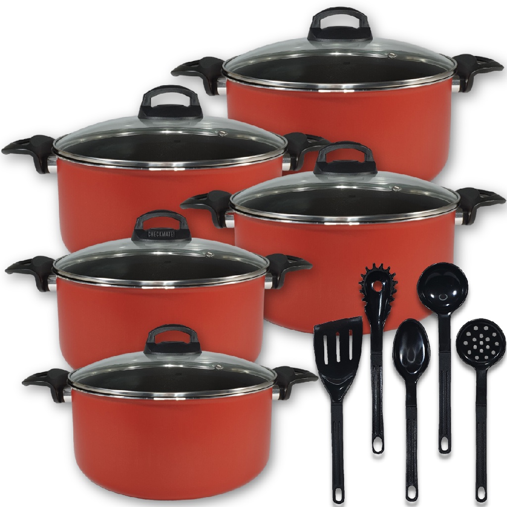 Jogo De Panelas Plus 10 Peças Caçarolas 16 a 24 cm Antiaderente Teflon com Tampa de Vidro Vermelho e Preto
