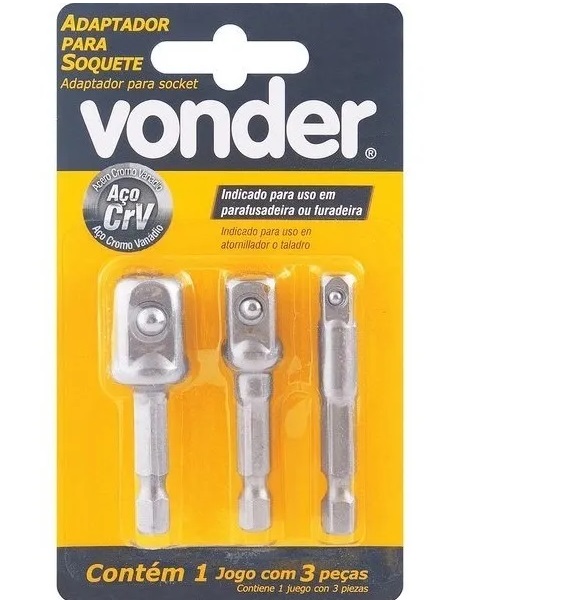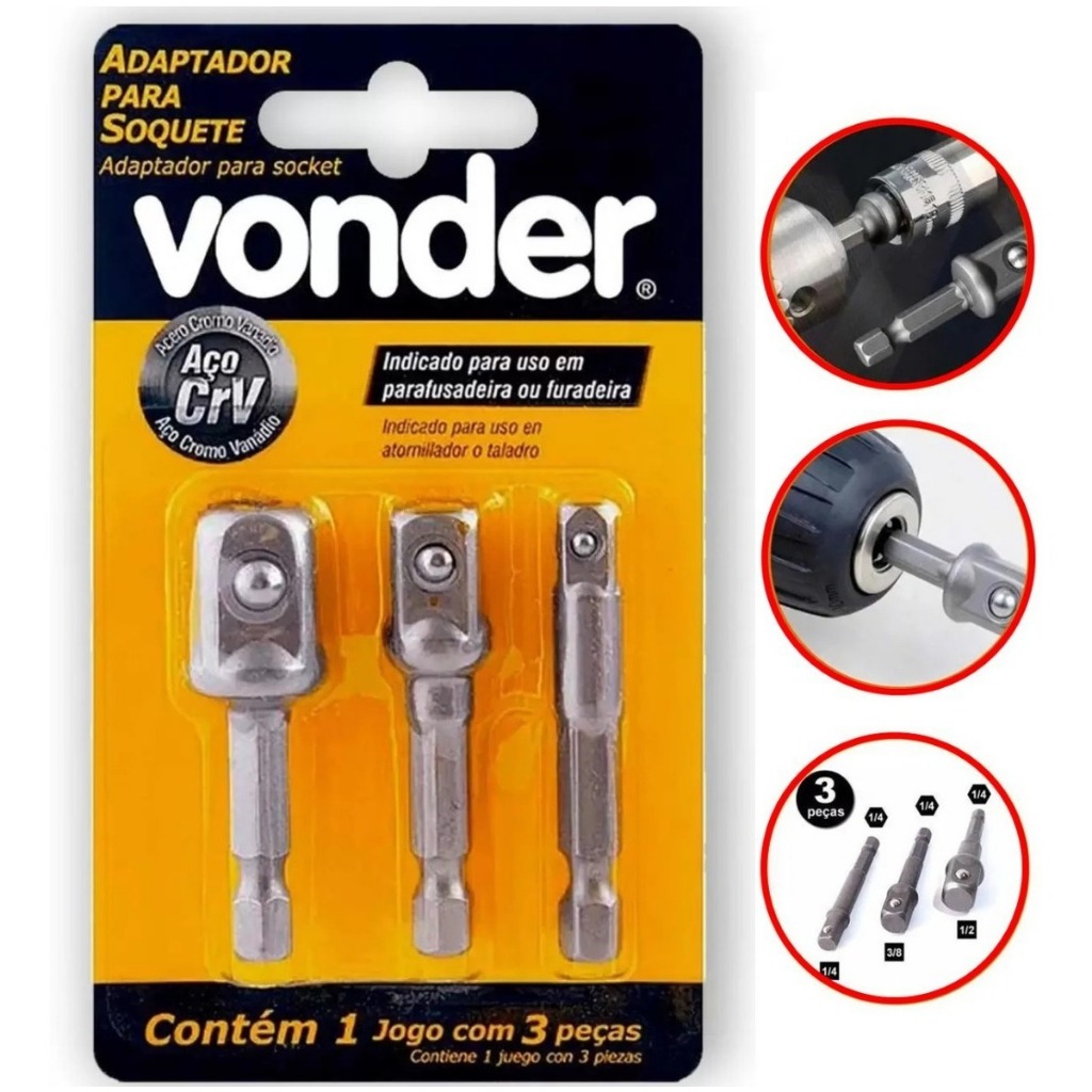 Jogo Adaptador para Soquetes Furadeira Parafusadeira 1/4, 3/8, 1/2 com 3 Peças - Vonder