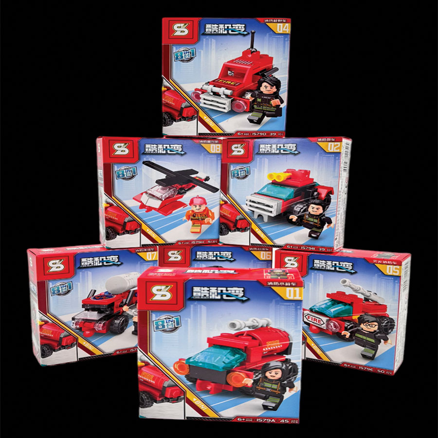 Brinquedo Kit 8 Blocos De Montar 8x1 Com Boneco E veiculo Sistema De Cambate A Incêdio Robô Coleção