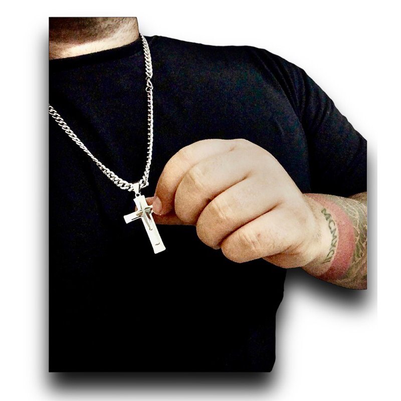 Kit colar Corrente cordao masculino Cruz prata prateado aço inox pingente placa Crucifixo pai nosso com pulseira Prata resistente antialérgico