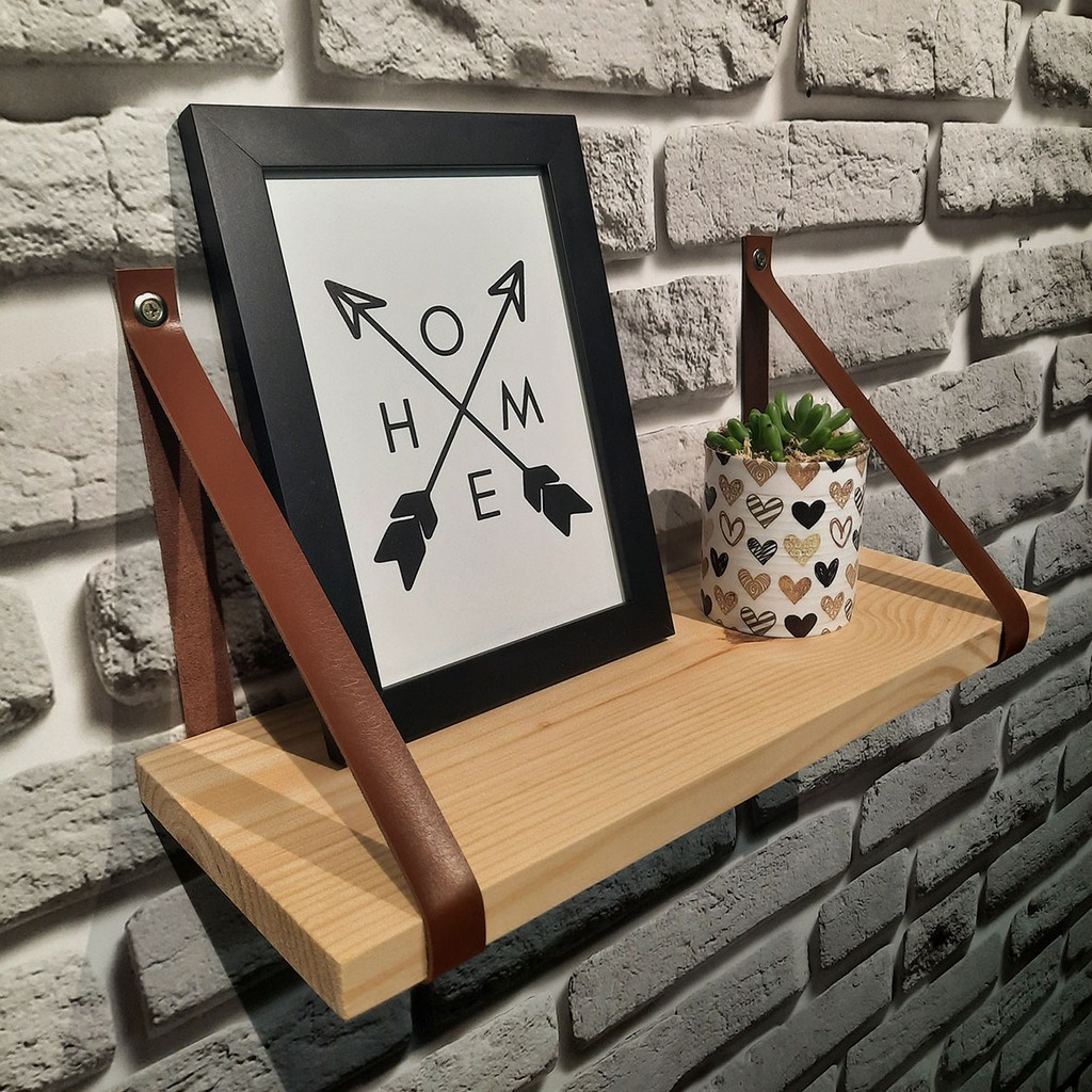 Prateleira de Madeira Pinus Maciça com Alça de Couro 4 Bases Suporte Decoração Sala Quarto Banheiro Escritório